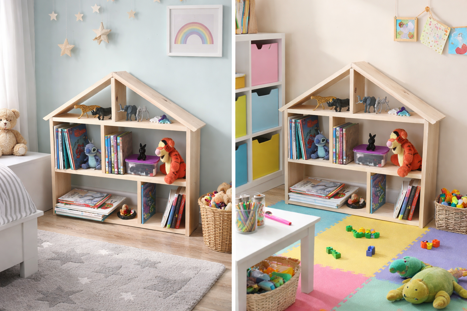 Looking for a storage solution that keeps books and toys organised while adding charm to your child’s room? This house-shaped wooden shelf unit combines practical storage with playful design, making tidying up feel less like a chore and more like part of the room’s character.