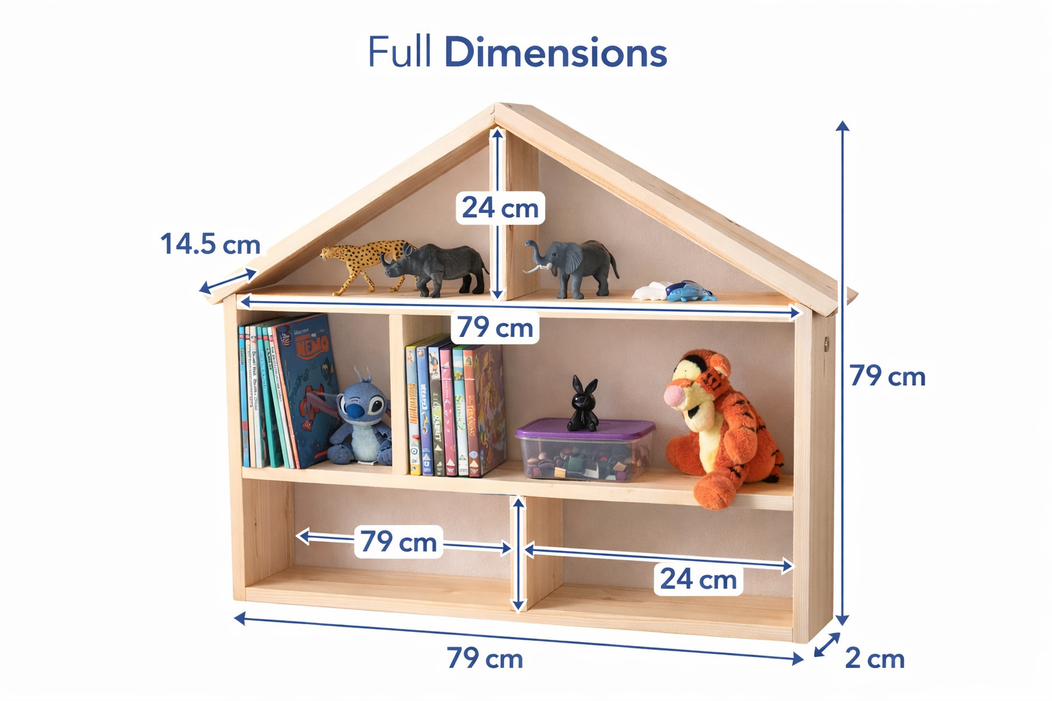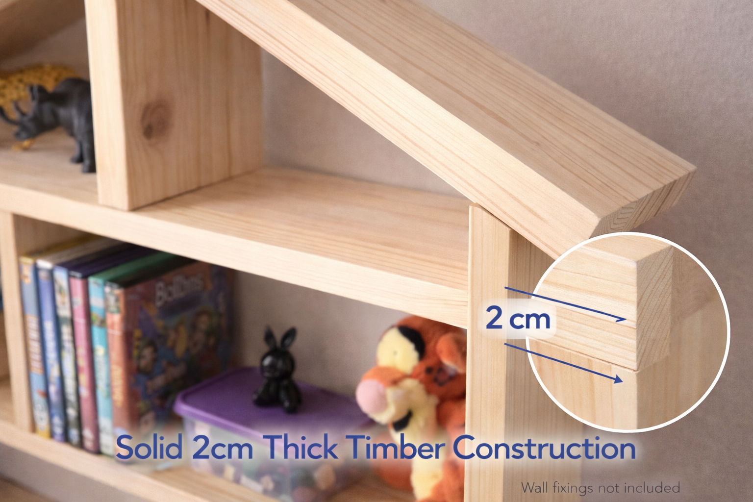 Crafted from 2cm thick planed timber, this robust shelf measures 79cm high and 79cm wide. The timber is sustainably sourced locally and carefully finished for a smooth, child-friendly surface.