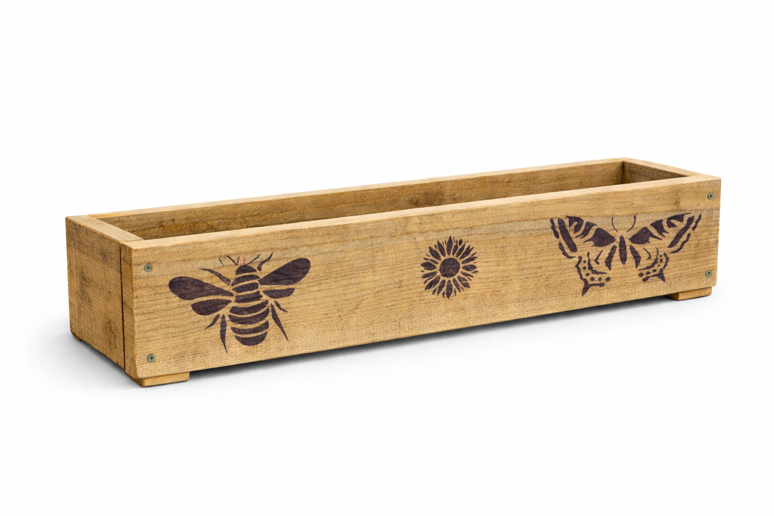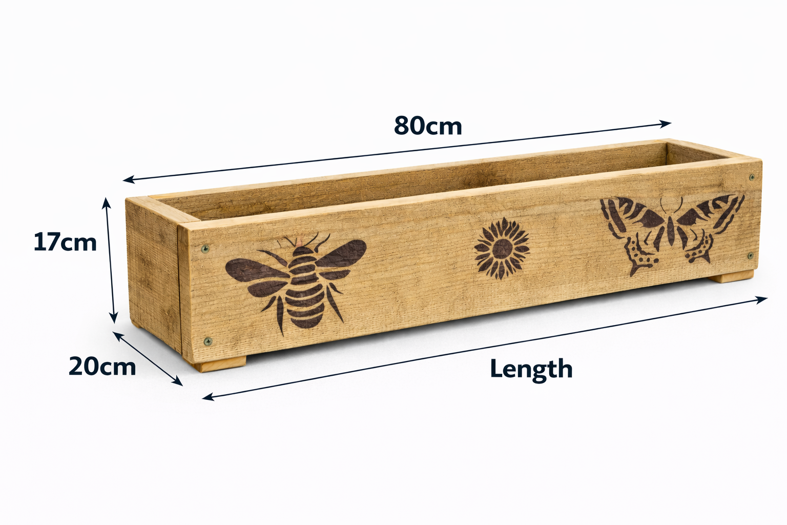 Handcrafted from locally sourced, sustainable rough sawn timber, each trough is left unplaned to retain its natural texture and individuality. The decorative designs are burned directly into the wood using traditional pyrography, creating a long-lasting finish that won’t peel or fade.