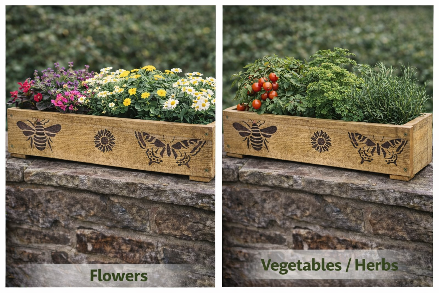 This beautifully decorated rough sawn garden trough brings rustic charm to patios, windowsills, and garden walls while creating the perfect home for flowers, herbs, or short-rooted vegetables.